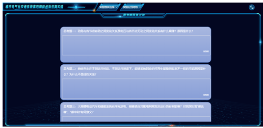 本实验项目设置知识点答题考核环节,通过选择、填空等题目测试员工对城市电气化交通系统虚拟仿真实验中各个模块知识点的掌握程度。设置思考题简答讨论环节,引导员工针对配电网搭建模块、轨道交通模块、电动汽车模块中引出的思考题进行头脑风暴。输入并提交简要答案后,可通过平台查看其它同学的回答,以论坛的形式展开讨论。