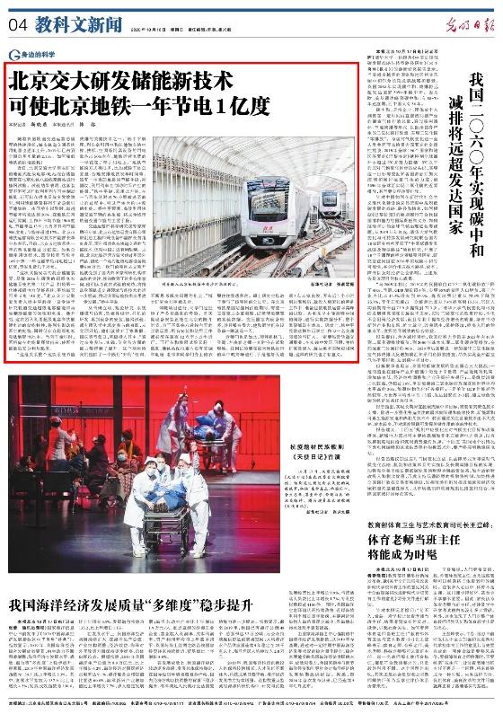 光明日报头条:北京交大研发储能新技术 可使北京地铁一年节电1亿度