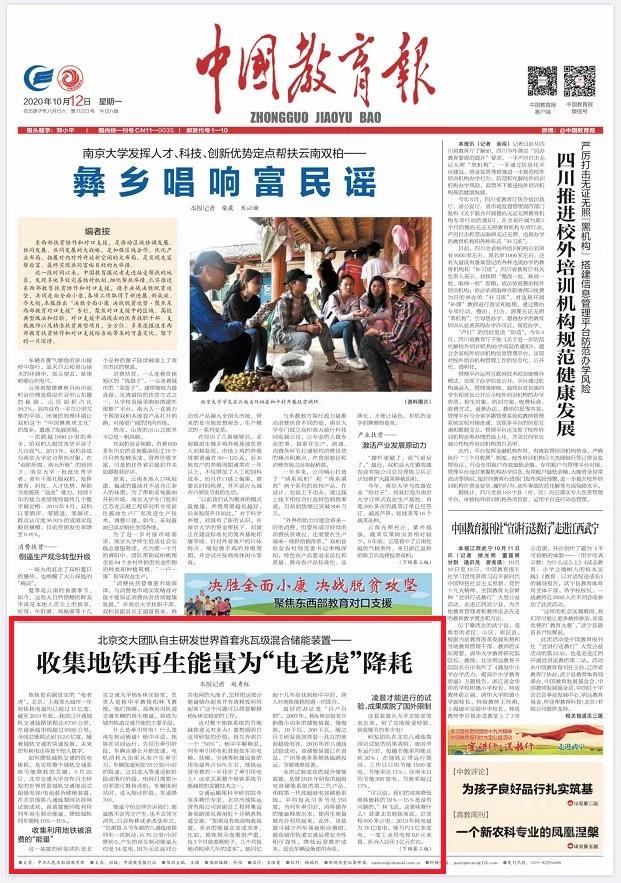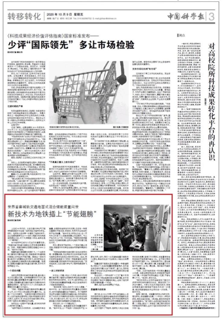 中国教育报头版:北京交大团队自主研发世界首套兆瓦级混合储能装置——收集地铁再生能量为“电老虎”降耗