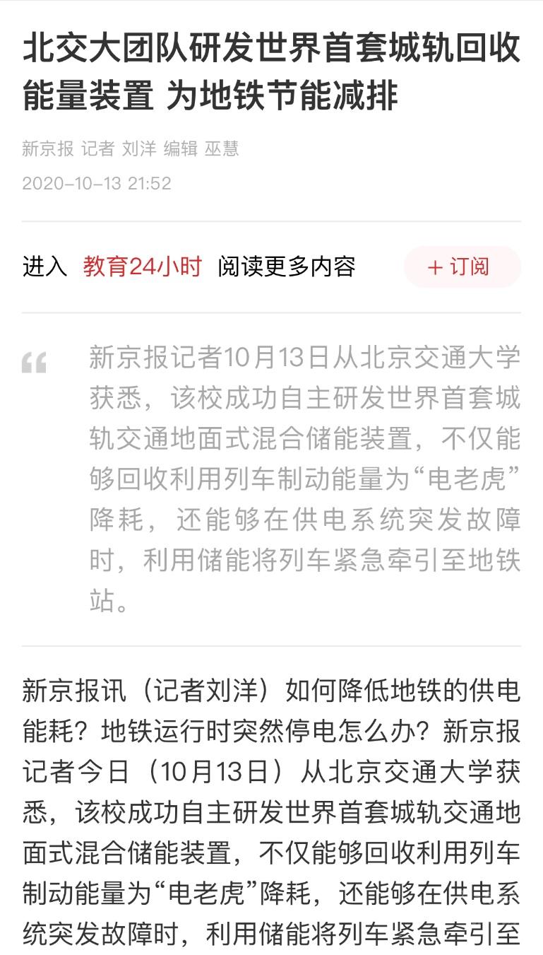 新京报:北交大团队研发世界首套城轨回收能量装置 为地铁节能减排