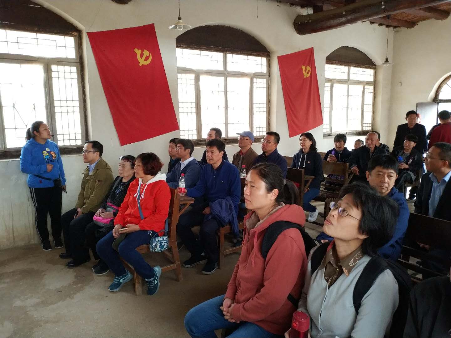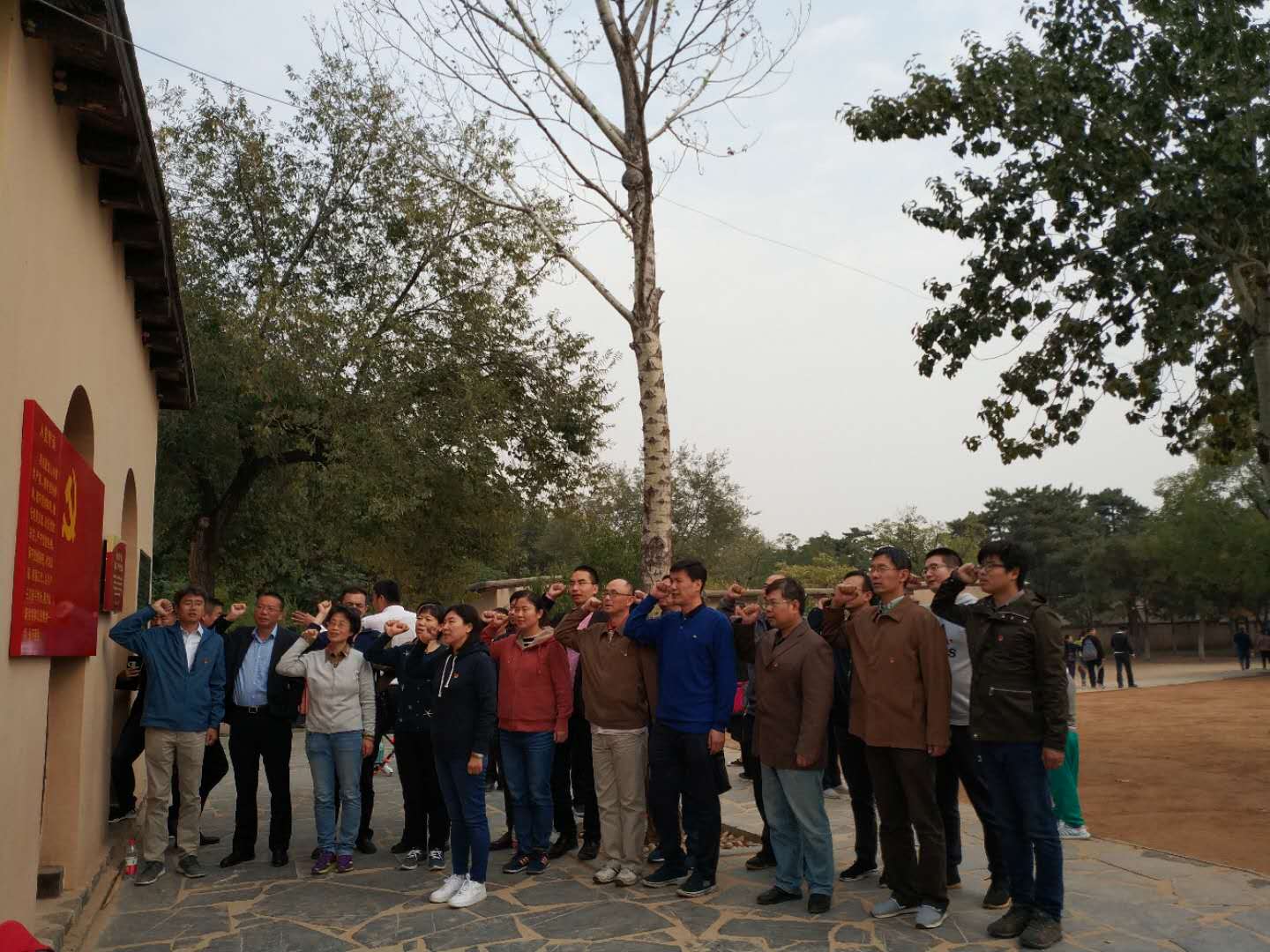 接下来参观党的七届二中全会会址,当时是西柏坡中共中央机关的食堂,正是在这简易的食堂中召开了决定中国命运和前途的七届二中全会,毛泽东同志提出了:“务必使同志们继续地保持谦虚、谨慎、不骄、不躁的作风;务必使同志们继续地保持艰苦奋斗的作风。”这一西柏坡铸就的不朽精神,永久感召着一代代后人,伴随中国历史的车轮永久载入史册。参观完七届二中全会会址,在屋外,对着党旗,我们重温了入党誓词,铿锵有力的宣誓声萦绕在每名在场的教师党员心中。