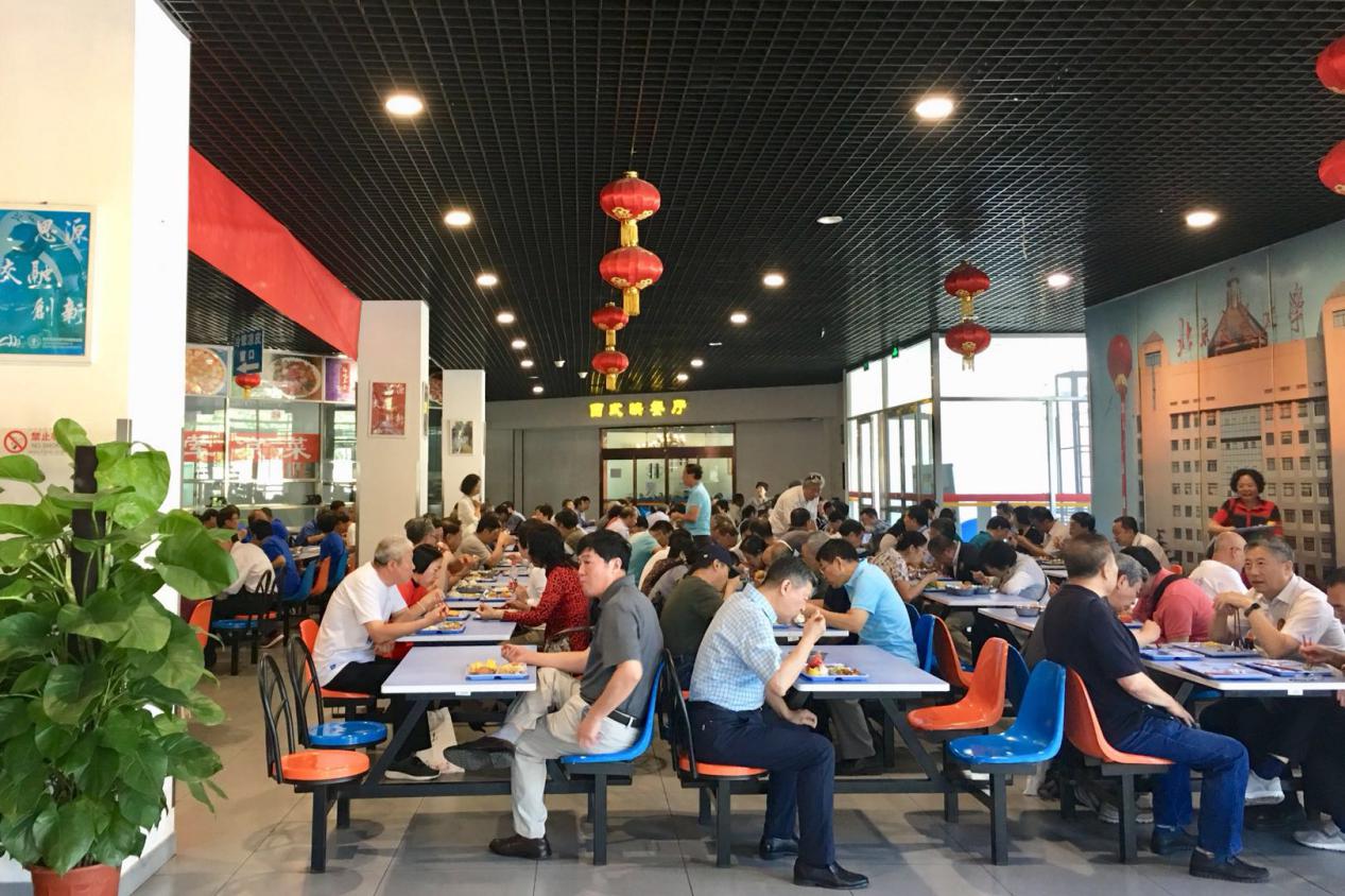 午餐时间,员工们兴致勃勃地到食堂会餐。与当年相比,食堂的设施与饭菜质量都有了极大的提高,看着各个窗口各式各样的饭菜,员工们感慨祖国和学校的快速发展。
