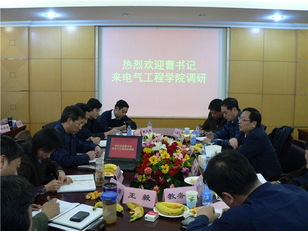 曹国永书记在认真听取学院工作汇报后,充分肯定了电气学院近年来在人才培养、科学研究、团队建设及与国内外知名企业合作等方面取得的成绩,并指出电气学院建立起来的学术交流平台以及与企业的合作方式很有特色。曹书记对电气学院今后的发展提出希望和要求。希望电气学院在谋划今后的发展时要注重打好改革牌和国际牌。以鲜明的学科特色为基础,充分认识并抓住《国家中长期教育改革和发展规划纲要》颁布实施、国家战略性新兴产业和综合运输体系建设、筹建创新基地暨新校区等重大机遇。抓好全面提高办学质量、推进改革创新和大力加强学风建设三大任务。进一步开阔视野和思路,加强与国内外知名企业深层次的合作,不断提高人才培养、科学研究和社会服务质量。要培养有国际视野,懂国际规则,能解决国际问题的一大批国际化人才。要大胆创新,勇于突破,深入研讨,科学民主决策,谋划好学院今后的发展和“十二·五”规划,进一步提高学院的整体发展水平。对于学院发展过程中遇到的一些实际困难,曹书记表示学校将结合实际统筹研究解决。
