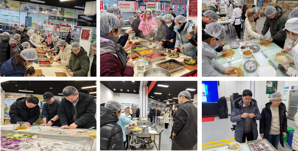 饮食中心的专业厨师们依次介绍并演示了蘸糖葫芦的技巧、驴打滚的制作过程、拌饺子馅的鲜香要点,老师们热情参与、相互配合、品鉴制作成果,活动现场欢声笑语、其乐融融。