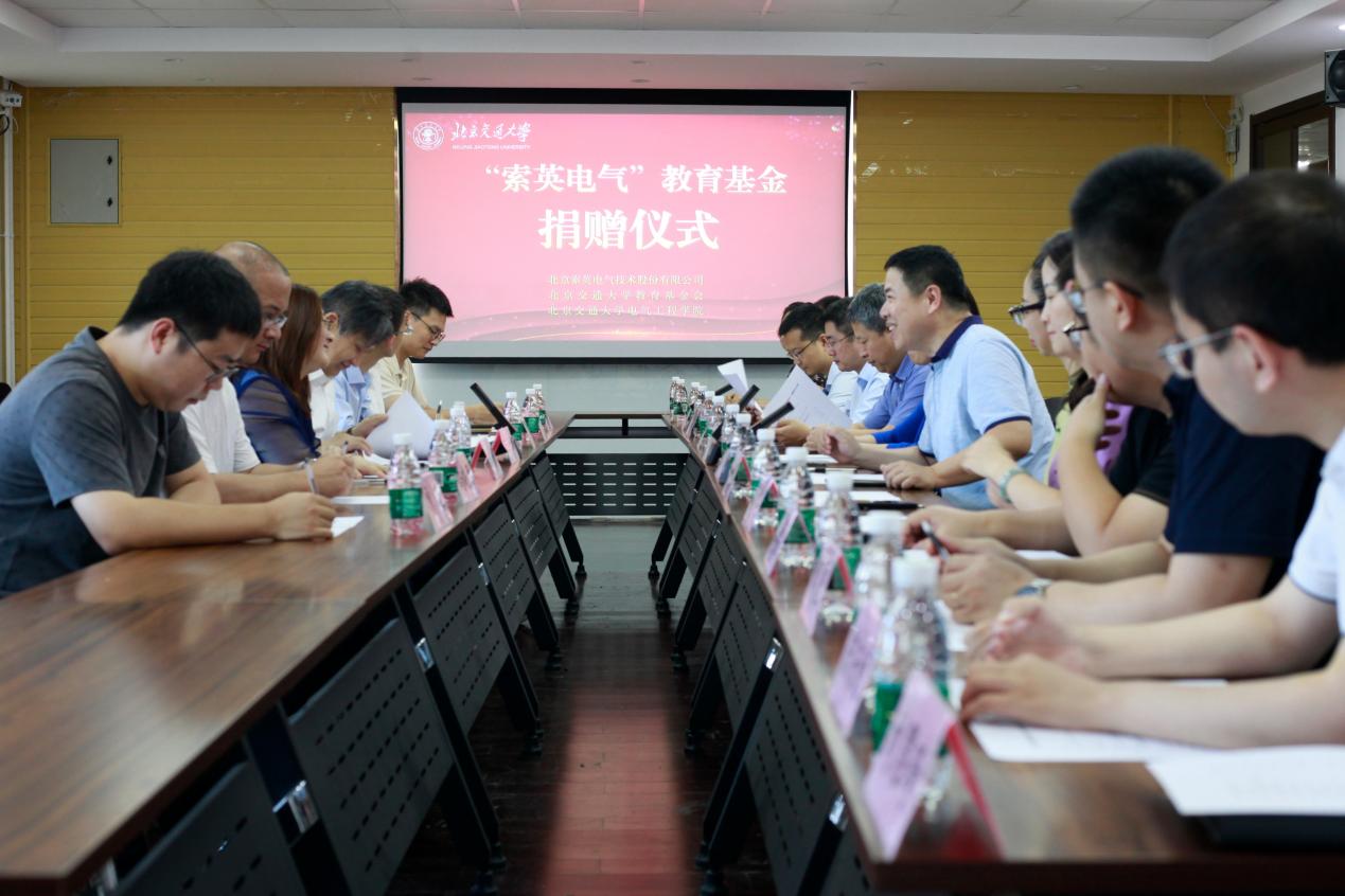 2024年7月18日上午,“索英电气教育基金”捐赠仪式在电气楼706会议室顺利举行。学校对外联络合作处处长、教育基金会秘书长郭雪萌,对外联络合作处副处长、教育基金会副秘书长郭祎华,公司党委书记王德瑜,经理吴命利,党委副书记、副经理王小君,党委副书记胡祥萍,副经理王琛琛,索英电气技术股份有限公司董事长王仕城、测控事业部总经理易虎、人事行政总监陈宇庆参加仪式。捐赠仪式由王琛琛主持。